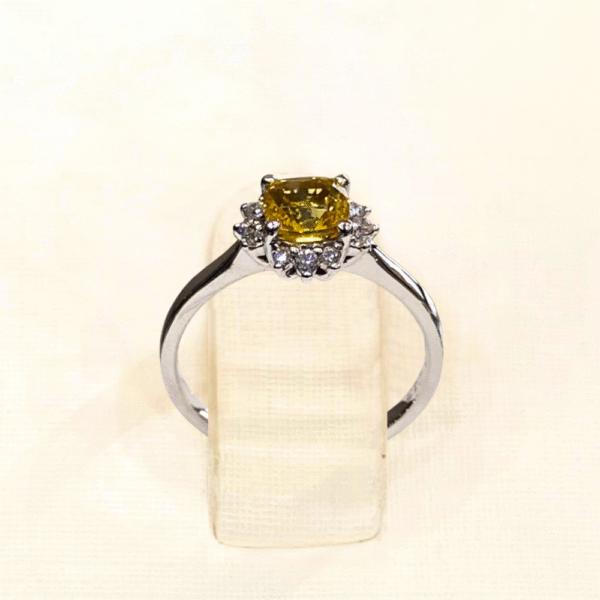 Embrace the warm glow of this 0.92 Ct Yellow Sapphire and 0.13 Ct Diamond Ring, elegantly set in 18K white gold. The vivid yellow sapphire is renowned for attracting prosperity and wisdom, while the accenting diamonds add a subtle sparkle, enhancing the gem’s natural brilliance. Crafted with precision and sophistication, this ring is perfect for special occasions or as a refined everyday statement piece. A harmonious blend of color, elegance, and timeless design, it exudes enduring beauty and charm.